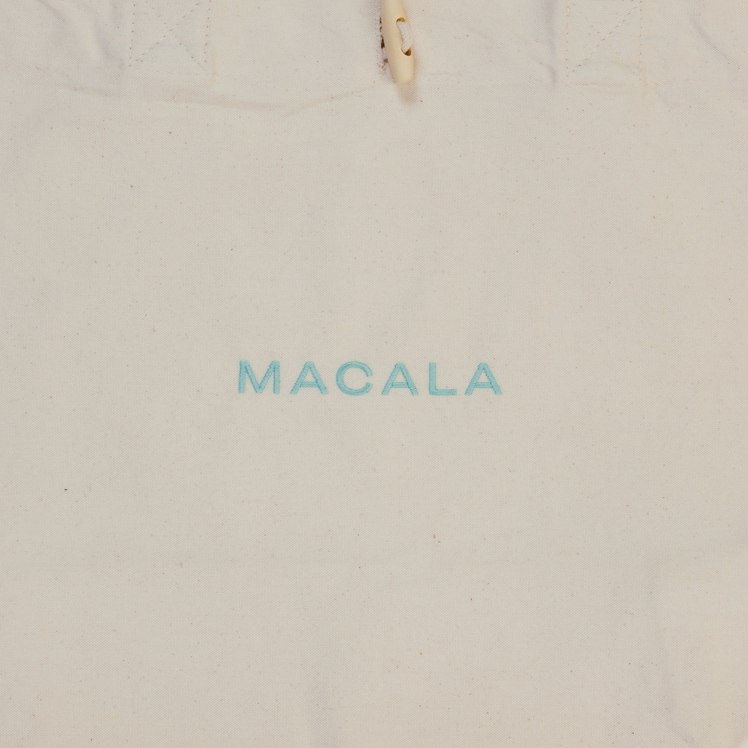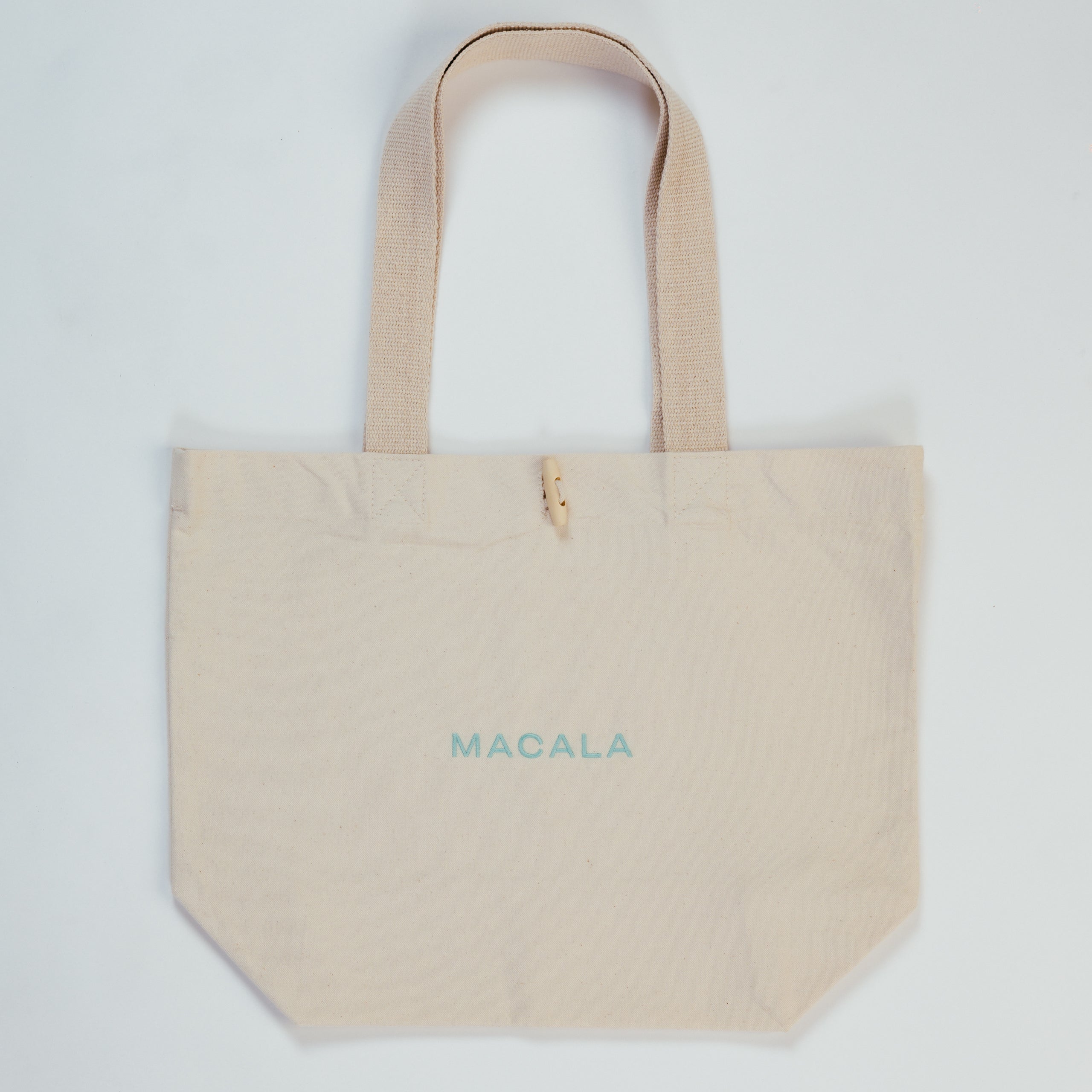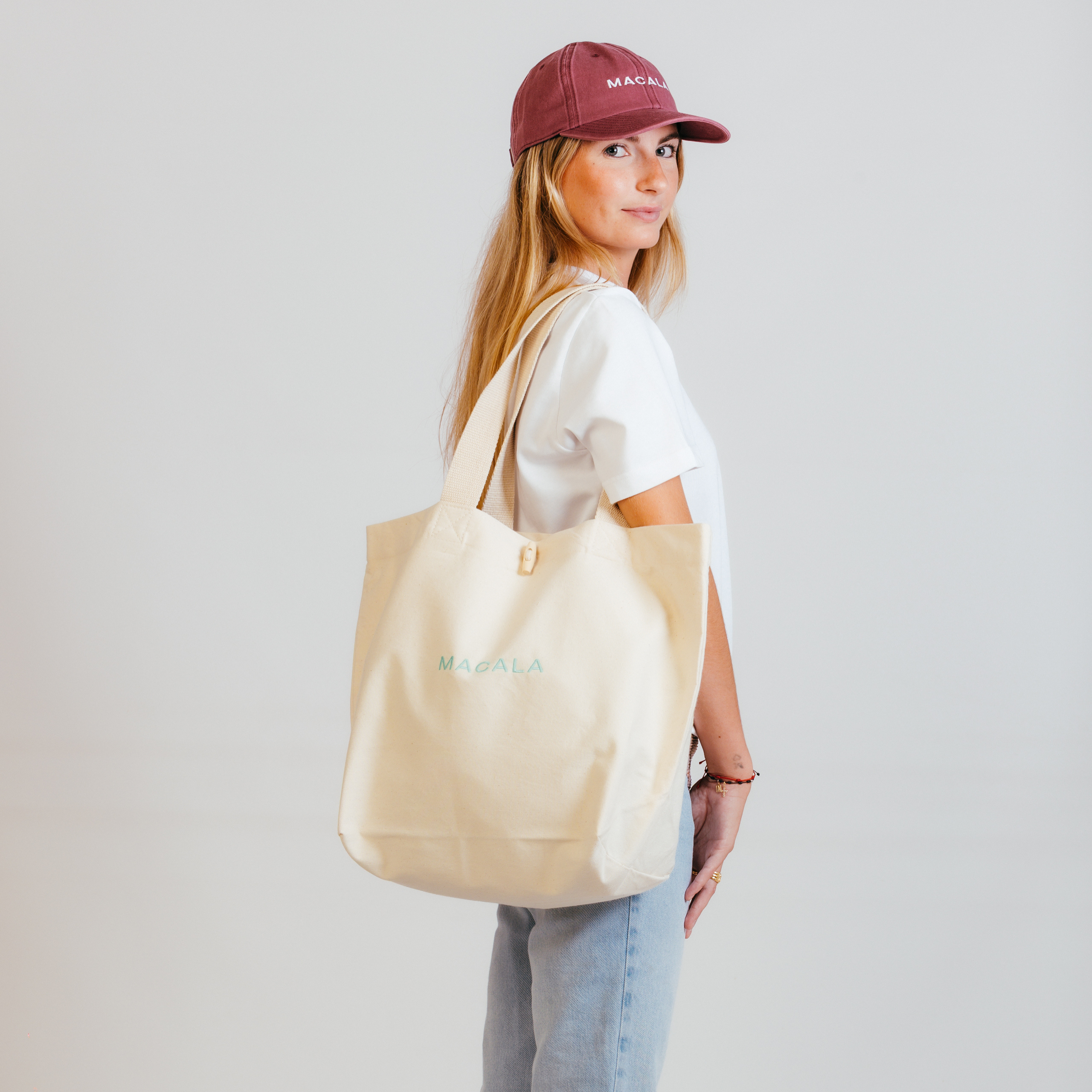 Confeccionada en lona de algodón orgánico 100%, la Tote Bag Macala es resistente, sobria y con detalles que marcan la diferencia: botón de cierre en madera natural y asas de algodón de 60 cm.